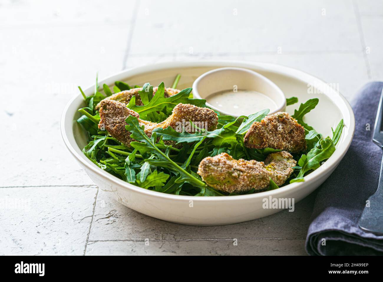 Batter Fried Avocado With Arugula Salad And Tahini Dressing Vegan Food Concept Stock Photo Alamy